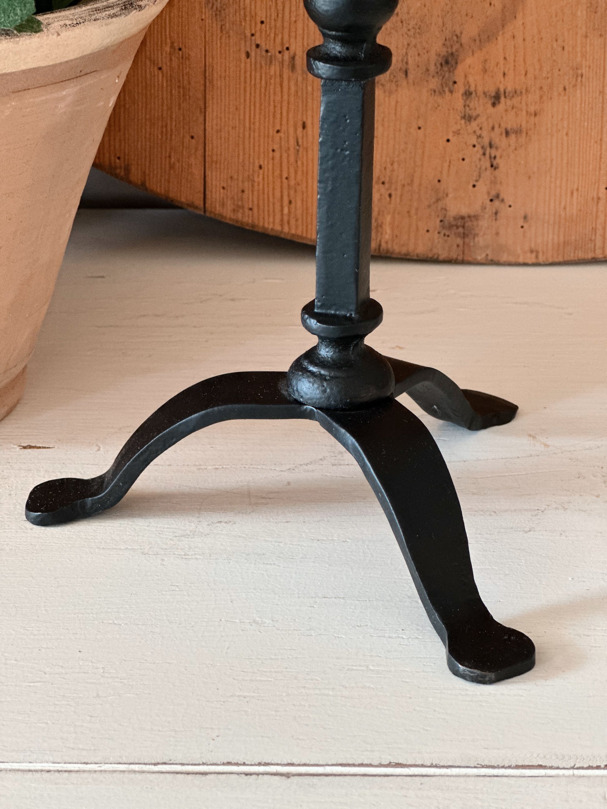 - Wrought iron and adjustable in height with a swinging arm.