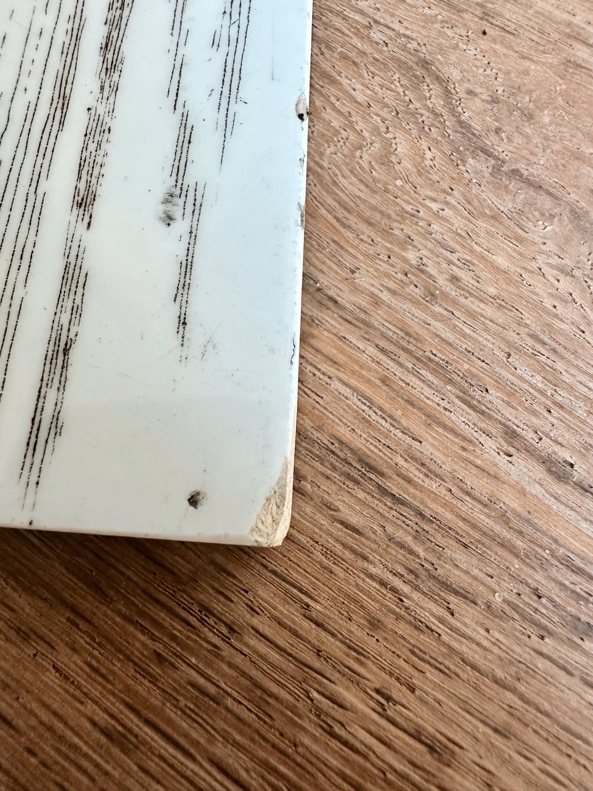 - There are a couple of small chips on the edges. That will easily be hidden by new grout if installed on a fireplace or backsplash