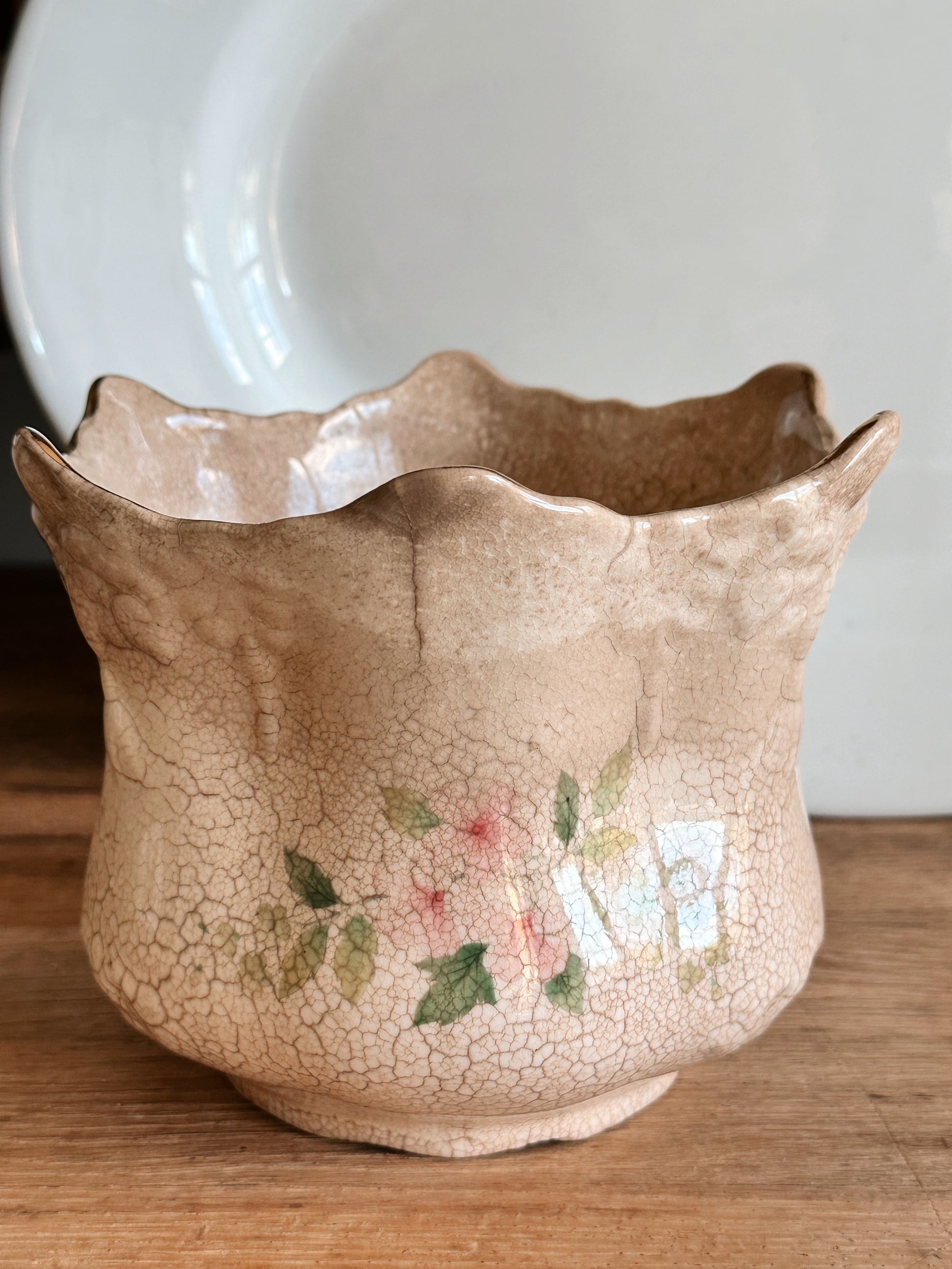 - Beautiful floral patter mixed with staining and crazing make for one gorgeous piece