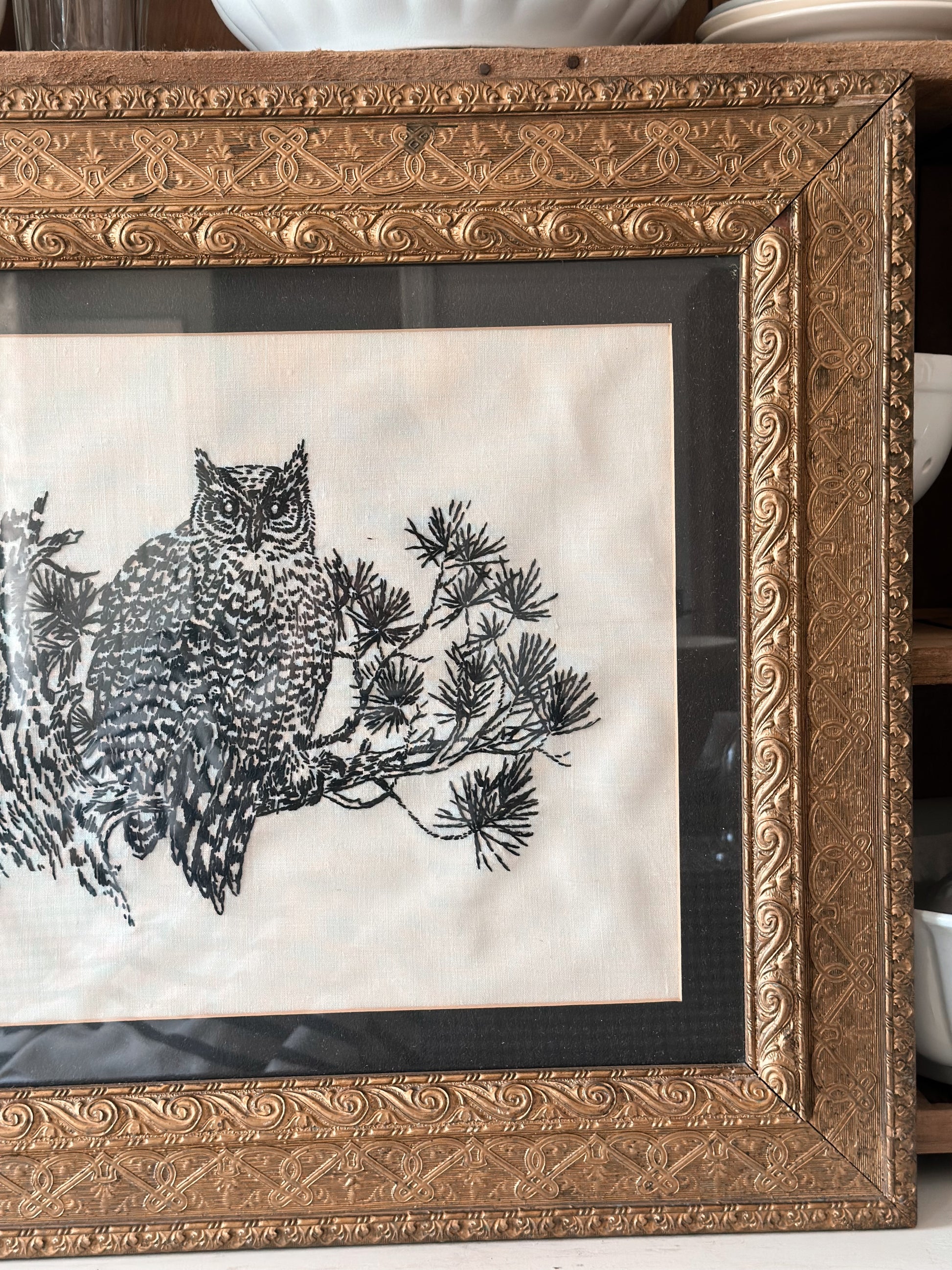 Beautiful Vintage Embroidered Owl in an Antique Frame