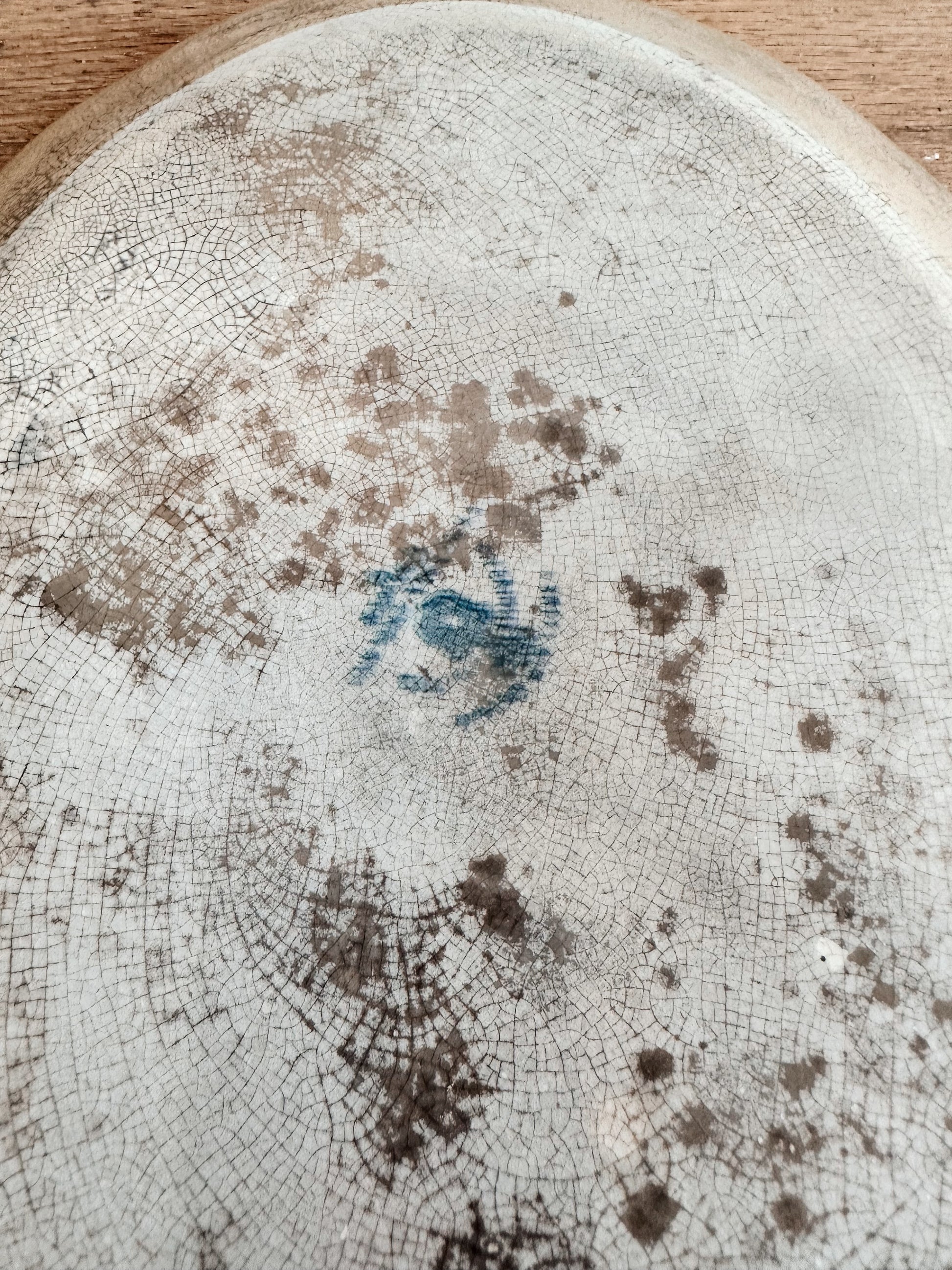 - The staining and crazing on this platter combined with the blue pattern make this piece jaw droppingly beautiful