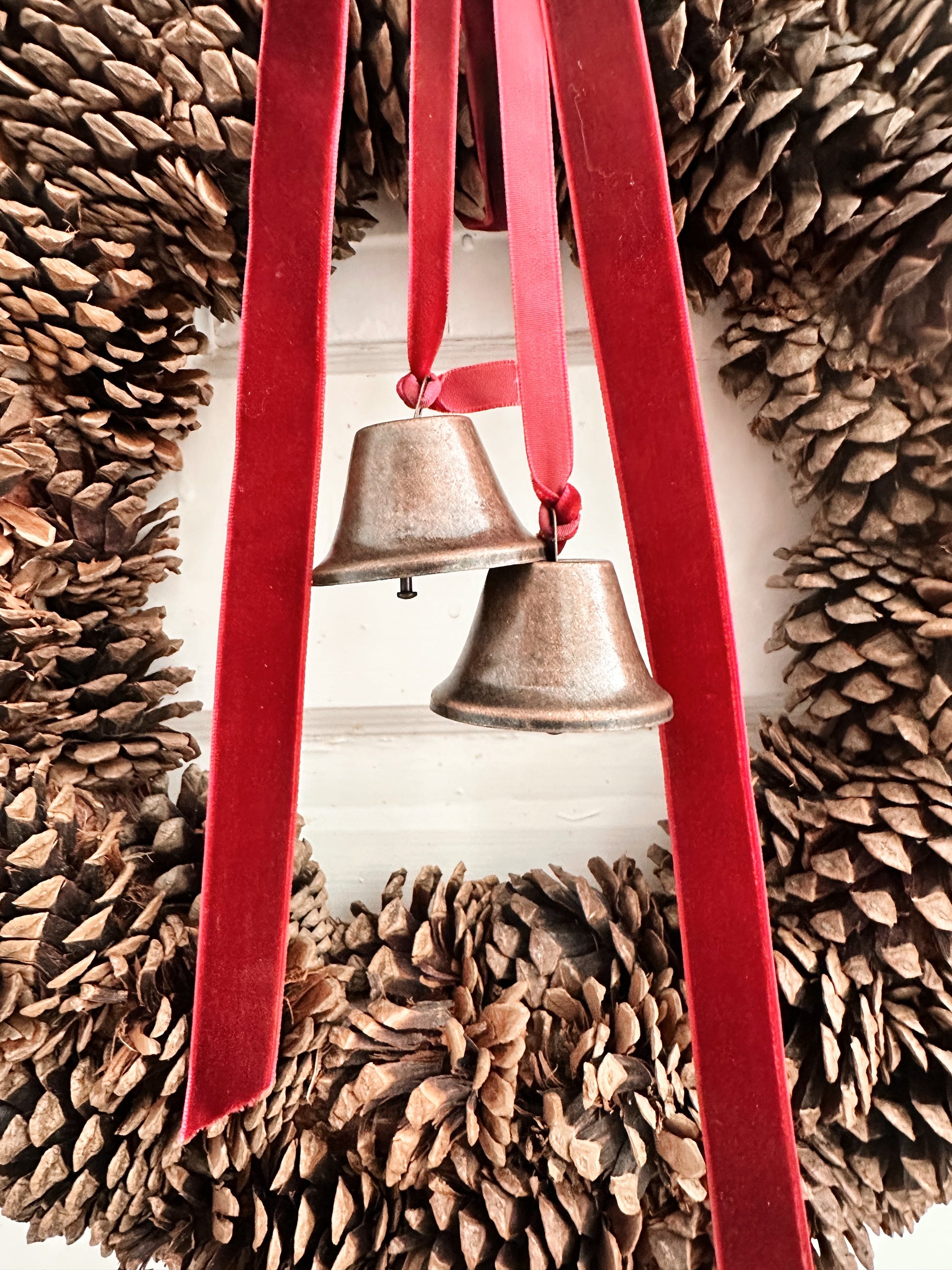 - Finished off with brass colored metal bells and a burgundy velvet bow