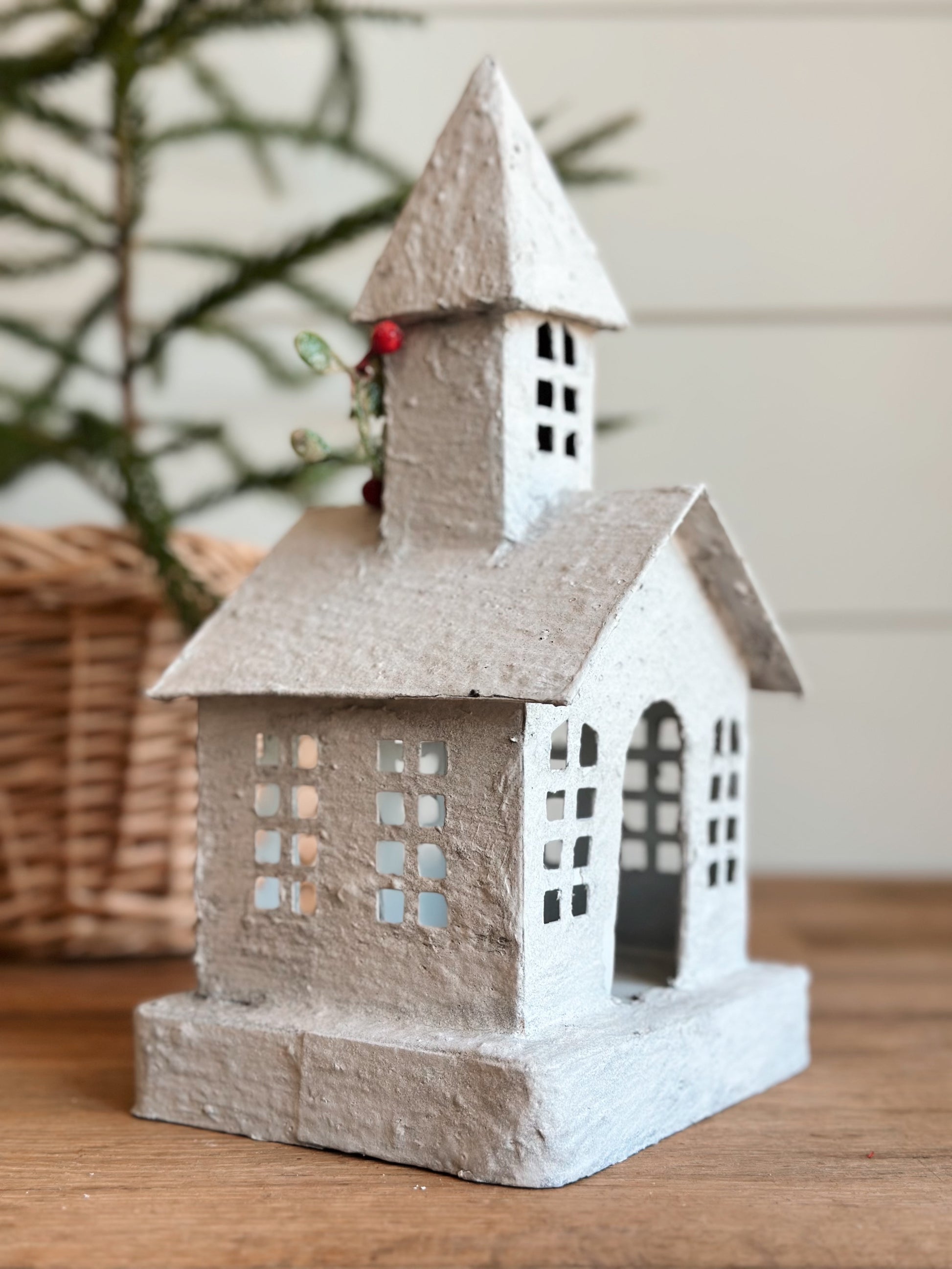 - This tin church with a snowy finish will look beautiful with a candle placed inside. We recommend using a tea light or LED candle